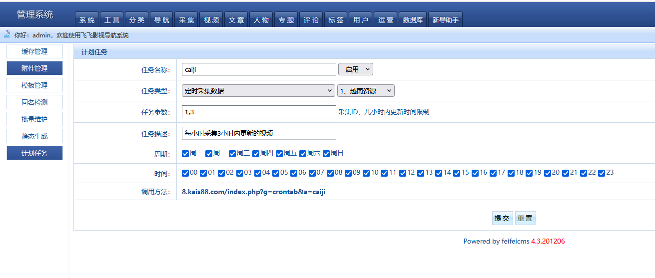 - 设置任务执行周期(如每天固定时间、每小时等,根据需求调整),填写任务名称(如 “feifeicms 定时采集”),点击「确定」(如图 8);